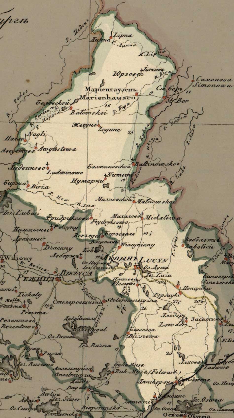 Lyutsin uezd on the General map of Vitebsk Governorate in 1820 year (fragment)